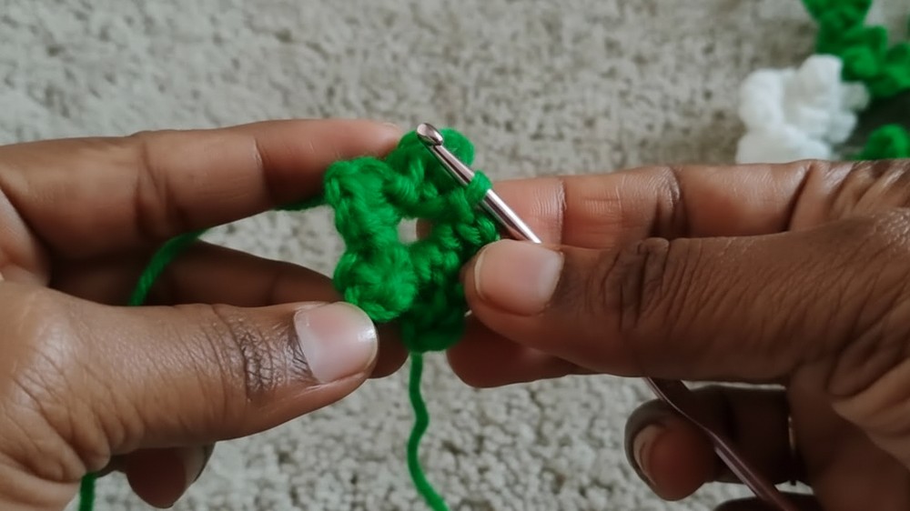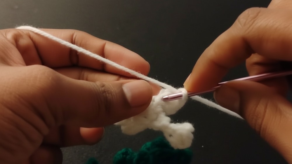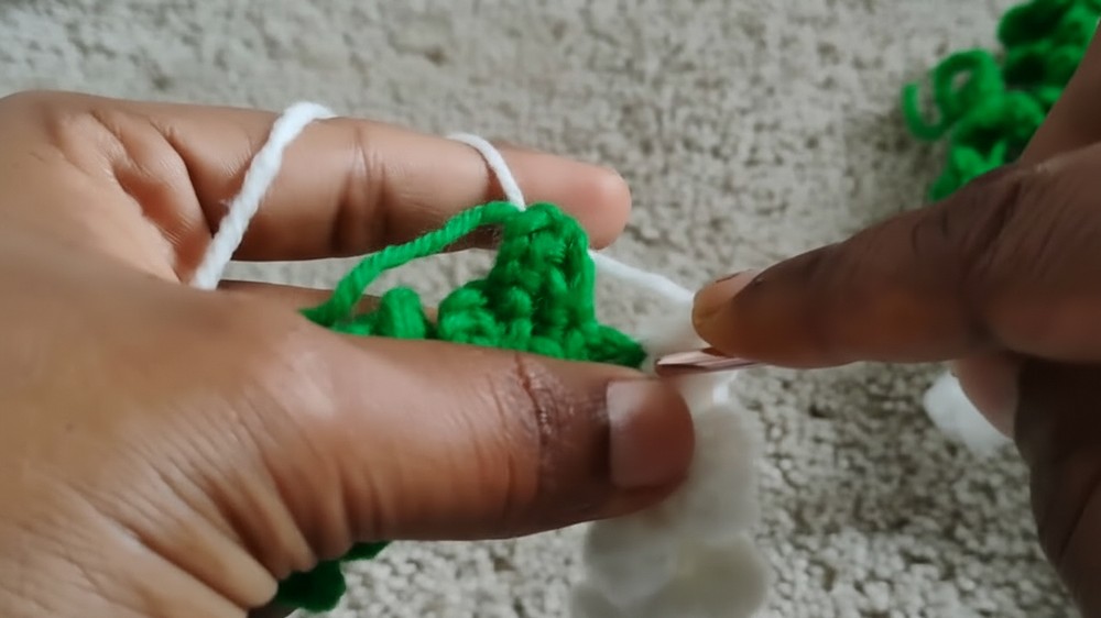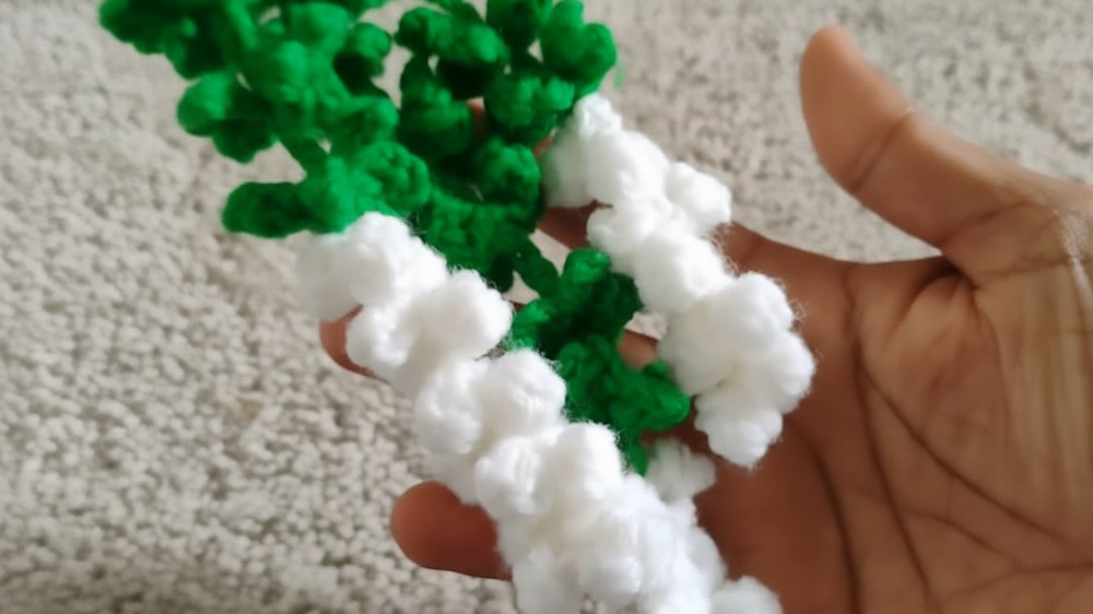 Once the vine reaches your desired length, switch to white yarn to produce the flowers by making chain three and working several incomplete half double stitches into the second chain to form a textured puff.