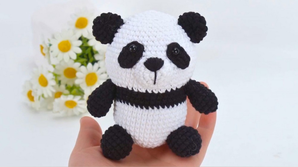 Integrated Color Work: The tutorial demonstrates how to switch between black and white yarn mid-row to create the facial mask and belly.
