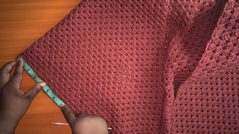 • With a measuring tape, designate 7-inch armholes. Use stitch markers to mark the points on both sides of the folded triangle.
