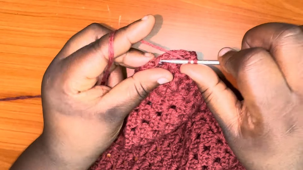 • At the start of each row, chain four and continue crocheting clusters of three double crochets in the chain spaces with a chain one between clusters.