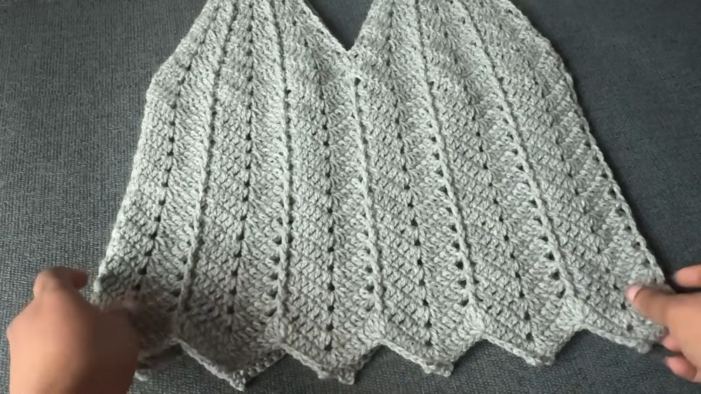 - The top consists of two panels, a front and a back. Create two identical pieces using the same pattern and then join the panels together using slip stitches along the sides to form the neckline and armholes.