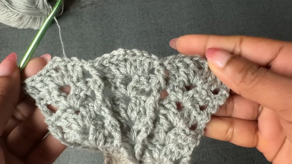 - From the second row onwards, turn your work and continue working shell stitches into the chain spaces of the previous row.