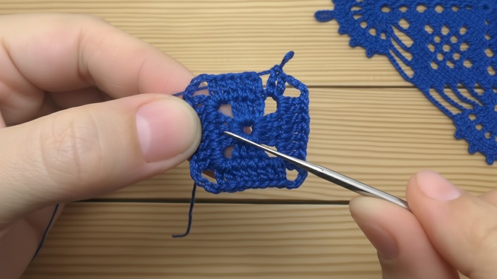 When weaving in the starting yarn tail, particularly from the center ring, ensure you weave it securely into the back of the initial stitches. This prevents the large center hole from loosening or unraveling over time, ensuring the motif maintains its shape.