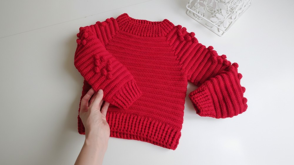 Beginners can enjoy learning this pattern too, as the popcorn stitch is satisfying to make and instantly improves your crochet skills, resulting in a sense of accomplishment as you see the jumper take shape.