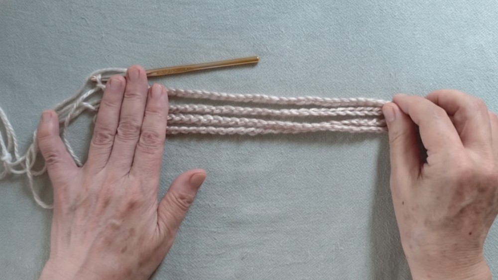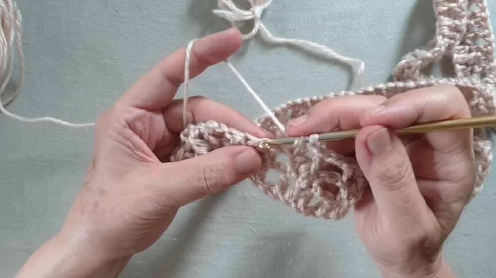 - Begin with Chain 3, standing up halfway, and crochet a double stitch starting from the 5th stitch.