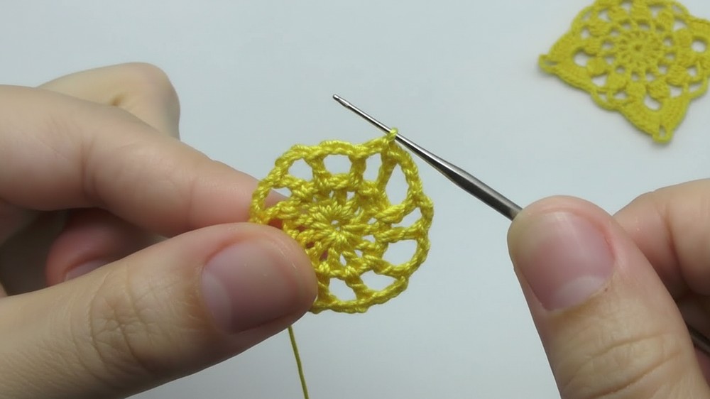When working the transition chain for the next row, use a stitch marker to secure the working loop before you begin crocheting the new motif. This prevents the previous motif's loop from unraveling while you are establishing the foundation of the next one.
