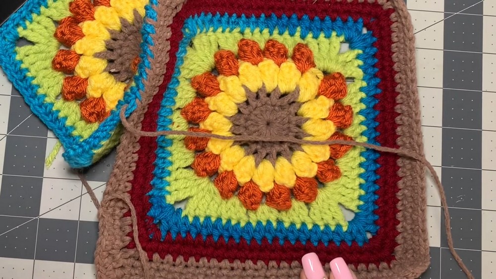 The pattern demonstrates how to craft the flower design using simple techniques like puff stitches and treble crochets before transforming the motif into a square.