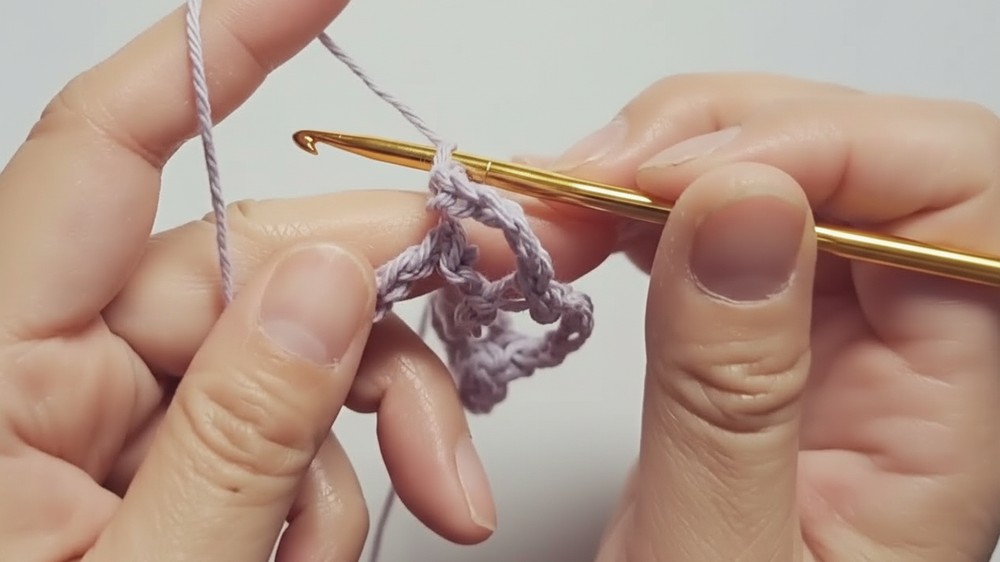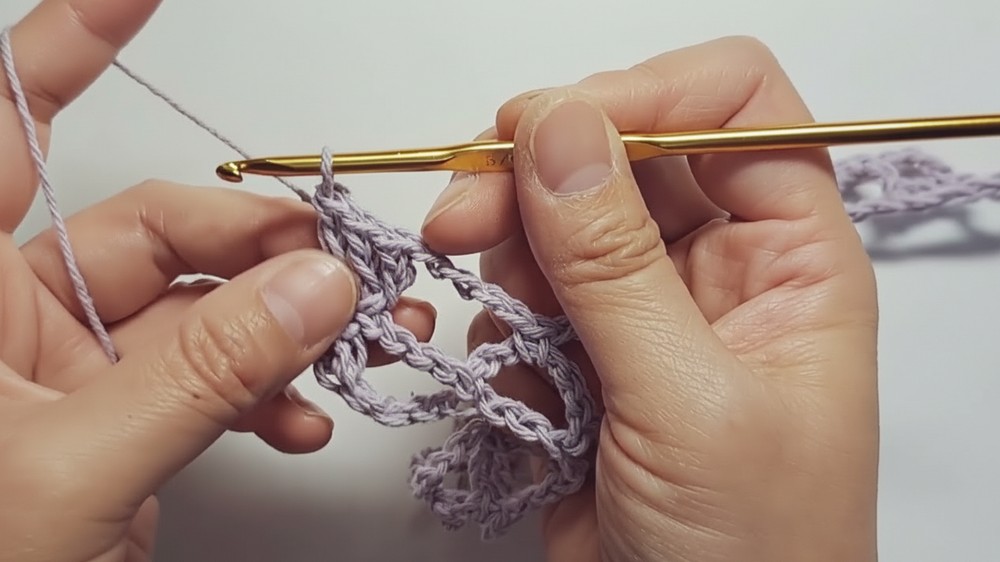 Expansion (Rows 2–4): Increase the number of DC stitches at the edges while decreasing the number of chain loops in the center of the motif to create a fan-like expansion.