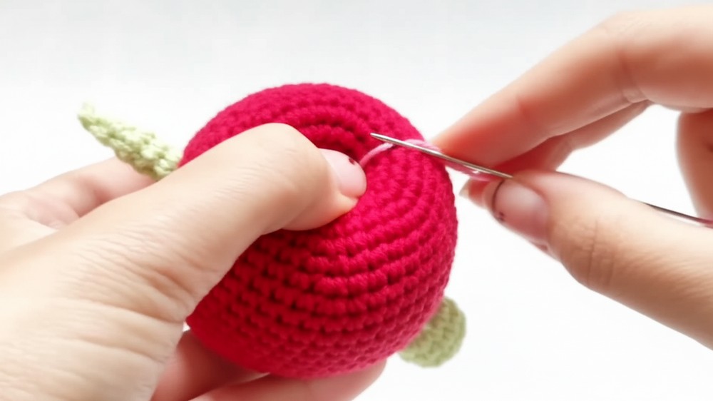 • Use a Tight Decrease Method: For the apple body's decreases, use a method that hides the stuffing. The tutor suggests inserting the hook into the front loop of the first stitch and then both loops of the second stitch to create a very tight closure.