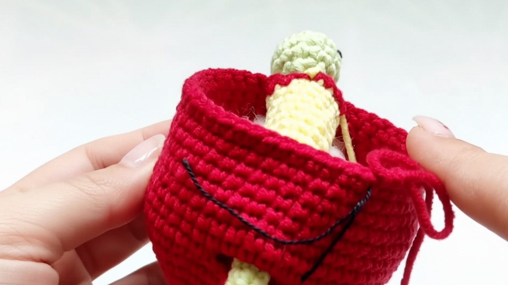 • Built-in Tunnel: You crochet a yellow tube and then crochet the red apple body around it, joining the tube at two points to create a continuous, fixed tunnel for the worm to pass through.