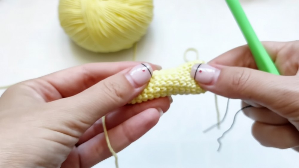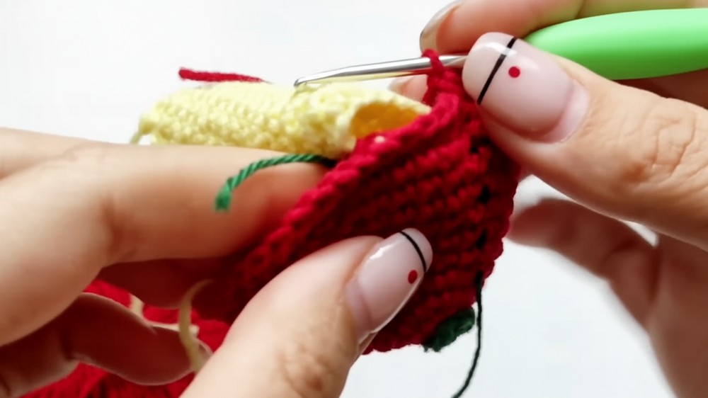• Complex Joining: The most difficult step is accurately joining the yellow tunnel to the red apple body on both sides while maintaining the correct stitch counts on all three components (apple, tunnel, and joining stitches).