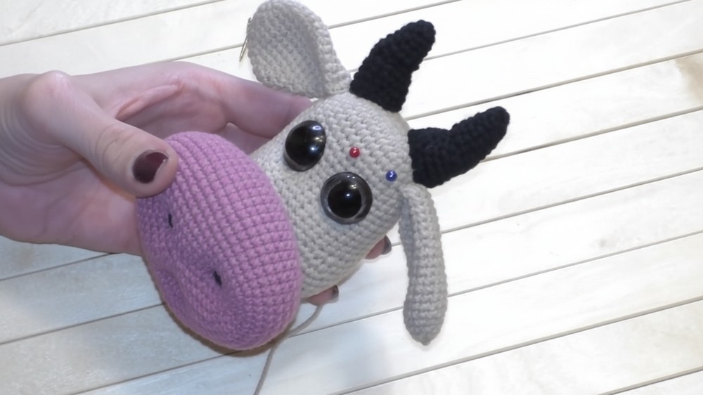 Facial Definition: The assembly process includes specific tensioning techniques (утяжки) to create indents for the eyes and a defined mouth line, giving the bull an expressive face.