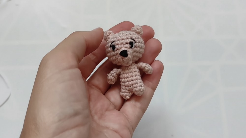 You have successfully completed the construction of the small amigurumi bear. By accurately executing the miniature pieces, carefully joining the body and limbs, and performing the delicate facial embroidery, you have created a whimsical and charming finished toy.