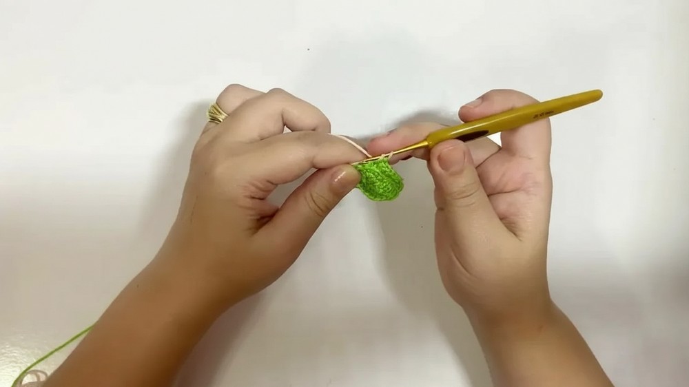 Secure the Eye: When closing the white eye base, do not pull the Magic Ring tight; leave a small hole where you will insert the large safety eye. After inserting the safety eye into the head, use silicone glue to secure the white crochet piece onto the green head to prevent movement.