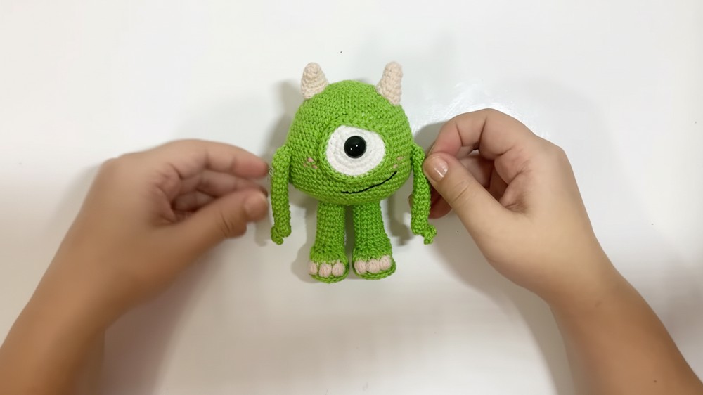 You have successfully constructed your own Mike Wazowski amigurumi! This piece showcases the technical skill required to blend crocheted body parts with unique features like the integrated eye and textured feet.