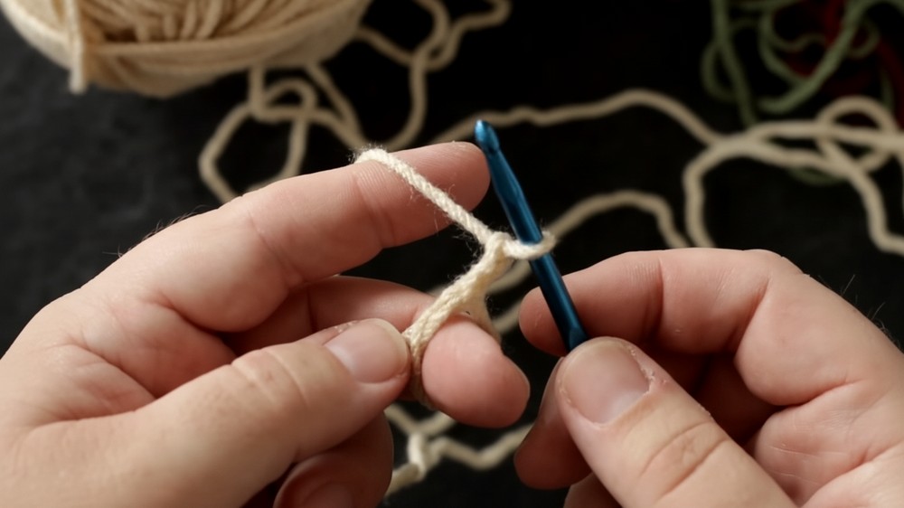 - Wrap yarn around your middle finger twice to form the loop. Insert the hook into the circle, yarn over, pull through, and chain 2.