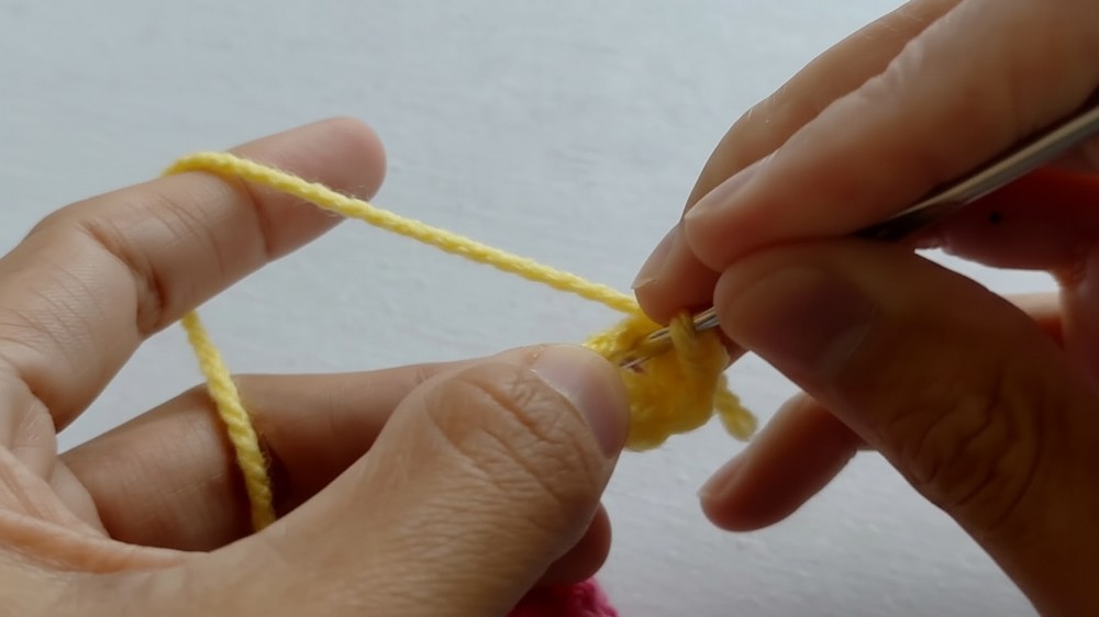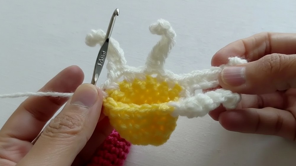 To make this piece, you start with a small loop in the middle and use basic crochet stitches to build the flower’s parts.