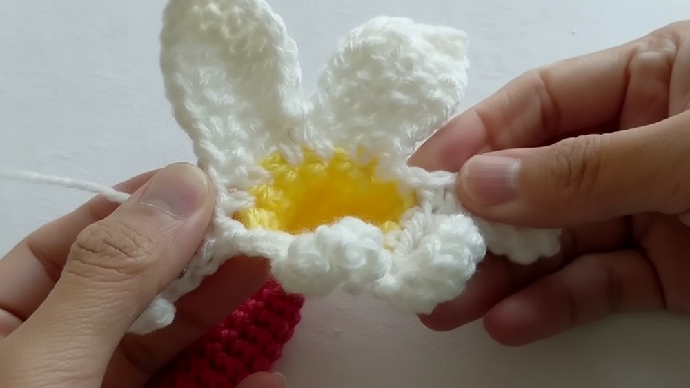 After you make the inner row of petals, more yarn is worked in rounds to create the outer row, so the flower looks full and layered.