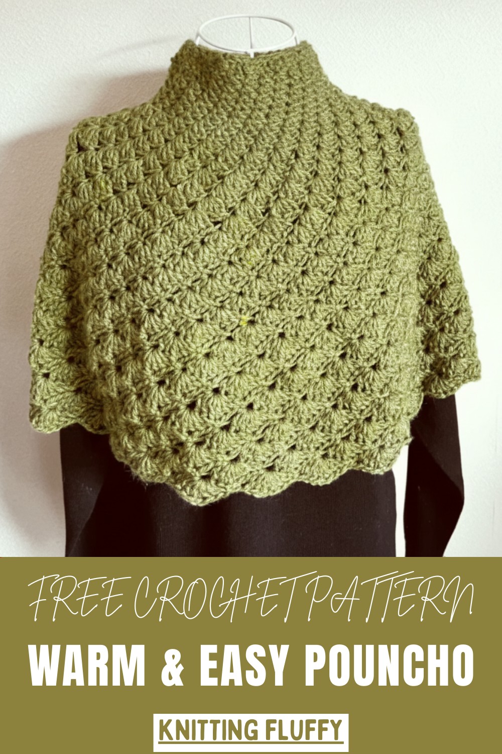 You successfully create a comfortable and stylish poncho by employing a clever stretchy foundation and a repetitive half shell stitch that naturally forms a beautiful diagonal pattern. The use of a larger hook at the end provides a final flourish of drape and width at the hem.