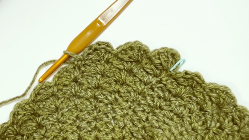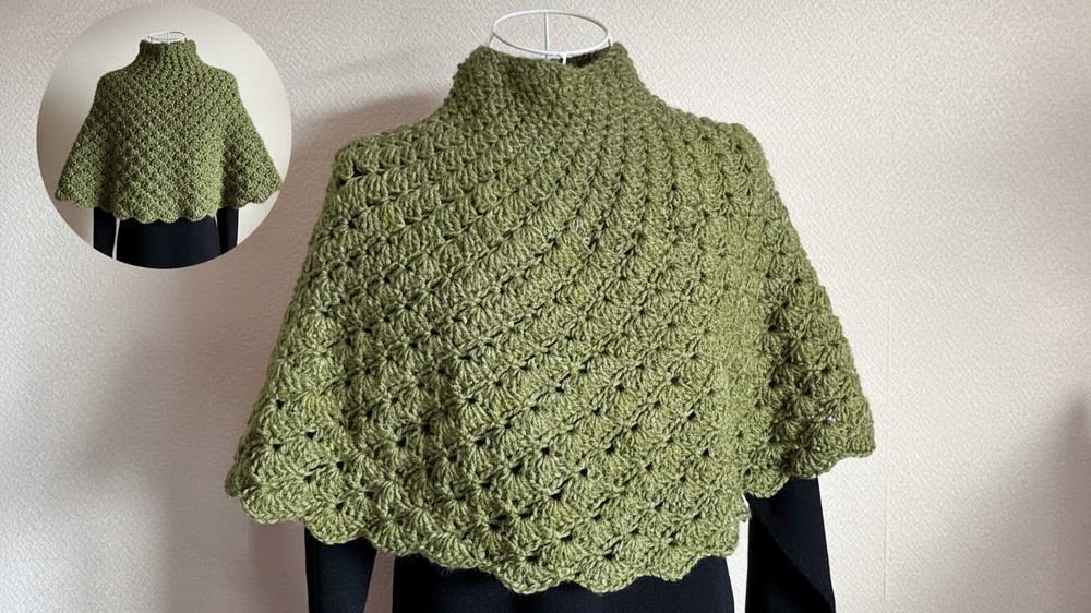 Gradual Increase: The circumference of the poncho increases by adding stitches within the half shell motif over multiple rounds, resulting in a subtle, wide flare at the bottom, which is functional and flattering.