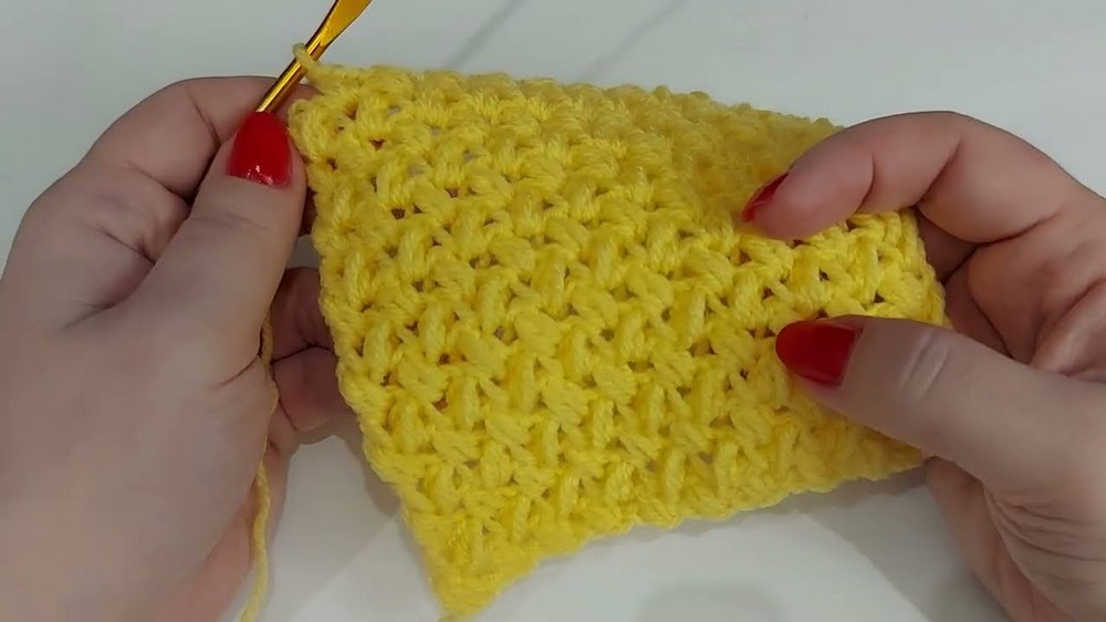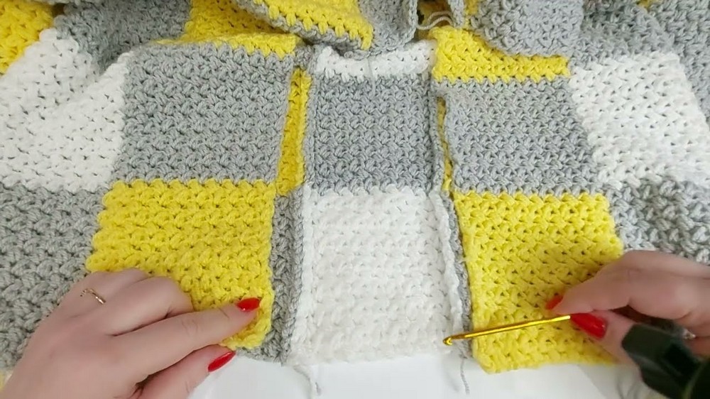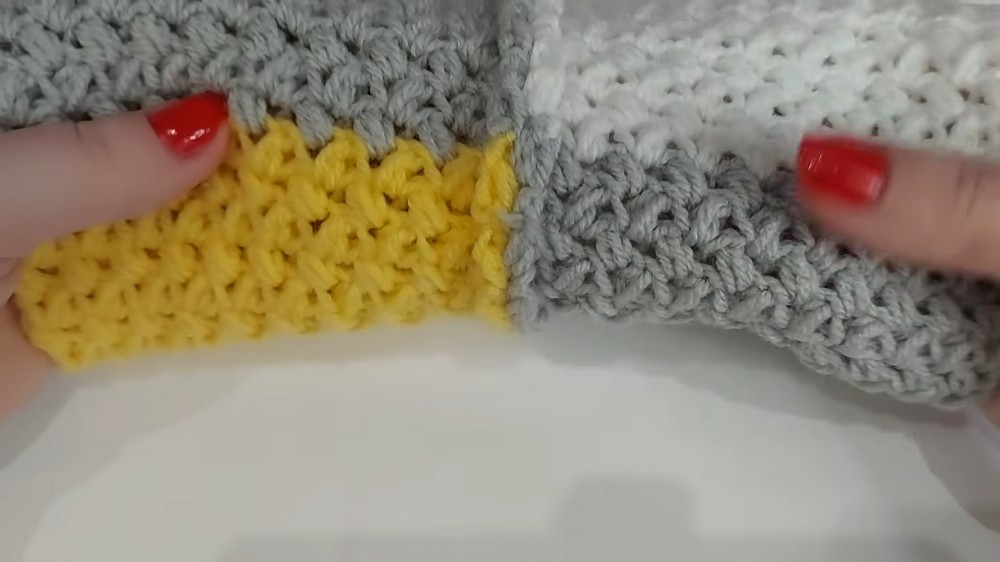 Joining Colors: When changing colors, pull the new yarn color through the final loops of the last puff stitch in the old color. Secure the tails later by tying the old and new yarn ends together to ensure a clean transition for the next square.