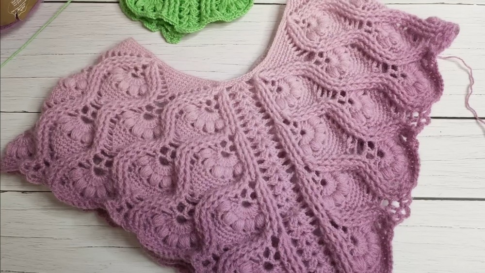 You have learned the complete technique for creating this beautiful textured poncho, from the unique starting chain to the core 7-row repeating motif pattern. By continuously repeating the 7-row sequence and correctly implementing the expansion in the first row of each repeat, you will seamlessly grow the garment to your desired size and achieve the lovely flower-like texture.