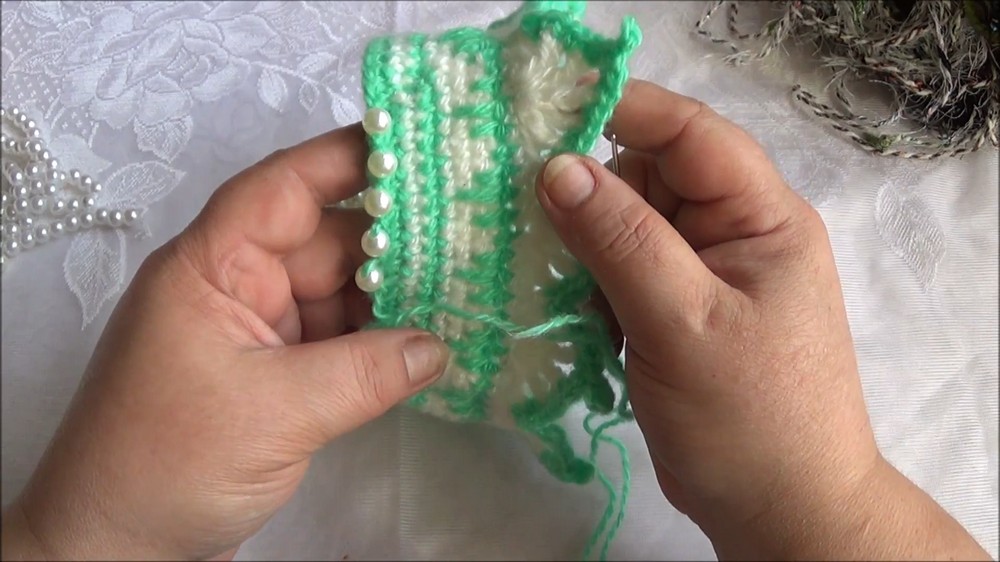 Headband Option: If you stop after the solid rows and before the lace points (after the white SC row following the textured dark row), you will have a wide, textured headband.
