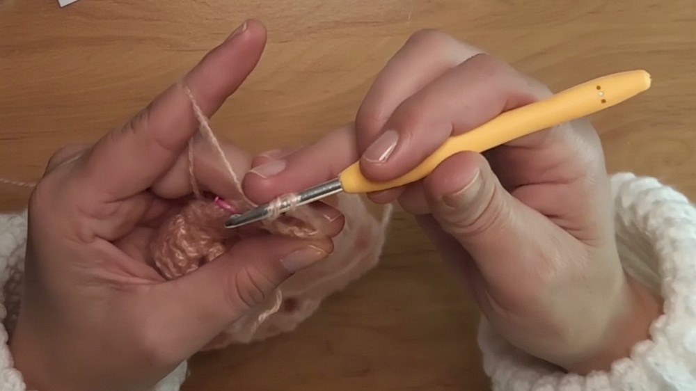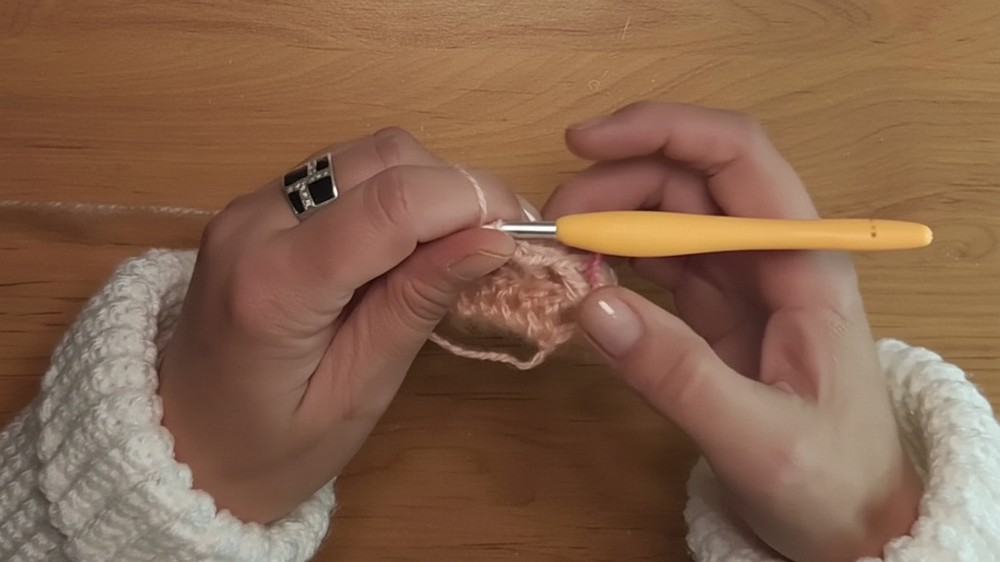 As shown in the referenced tutorial video, you begin by learning basic stitches — usually double crochet (dc) and single crochet (sc) — to build the back and front panels in one piece.