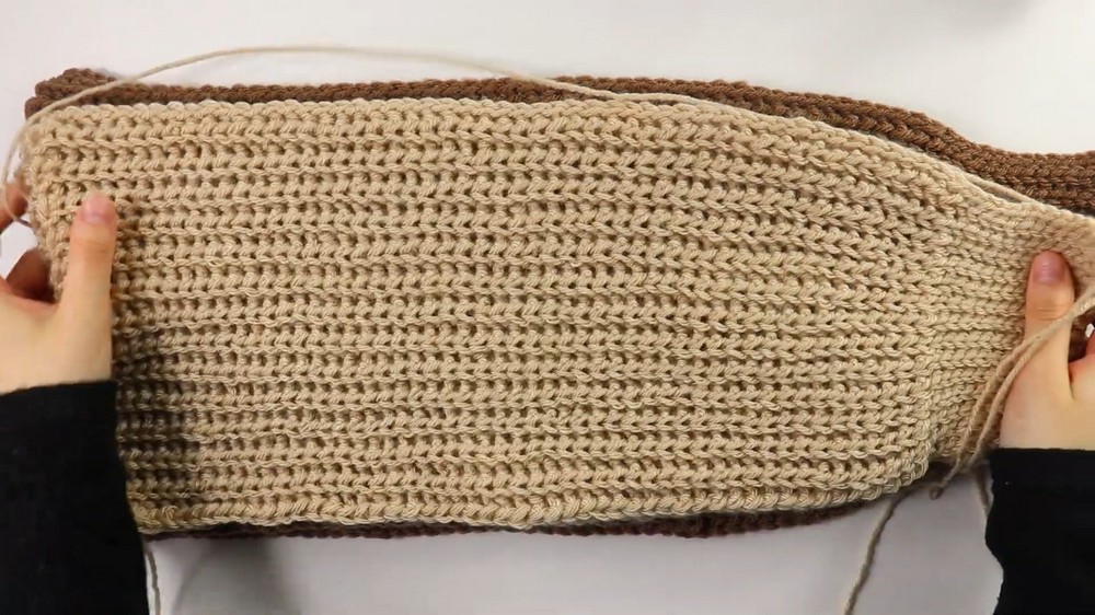 - Whip stitch them together, starting from the bottom and leaving a 7.5-inch gap at the top for the neckline.