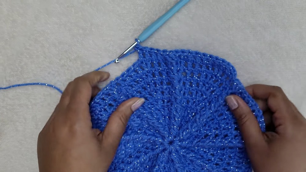 The hat gradually widens through strategic increase rows, which are spaced evenly to maintain a smooth, symmetrical structure.