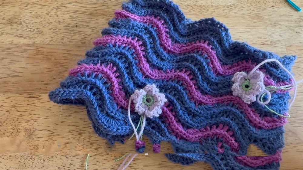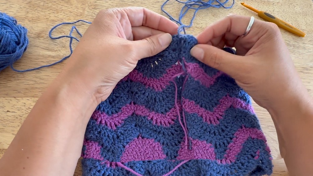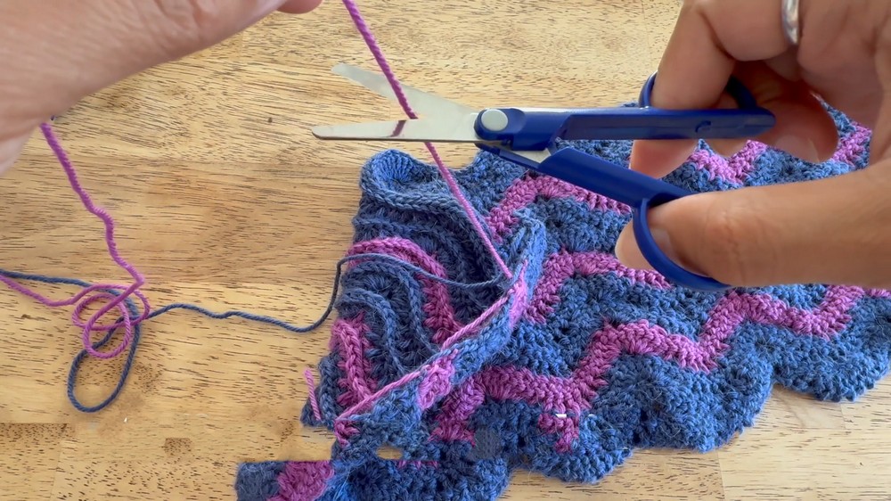 When switching colors or finishing rows, tug the yarn gently to secure consistency in stitches. Avoid pulling too tightly to maintain the scarf's soft texture and wave design.