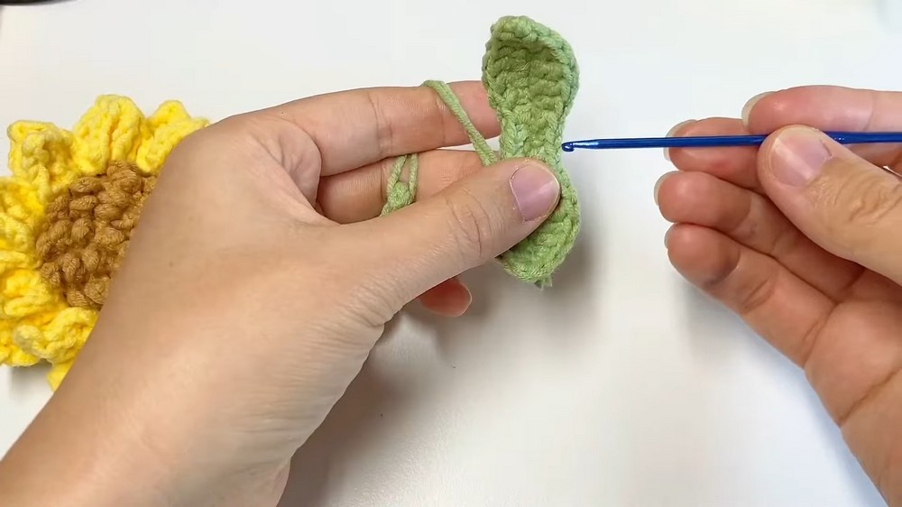 The sunflower is constructed using several distinct parts: a brown textured heart for the center, a green circular backing, and two layers of yellow petals. The unique "seed" texture in the center is achieved by working into the front loops left behind while crocheting the heart.