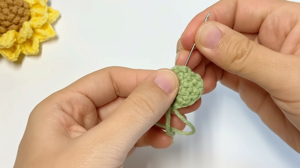• Yarn: Cotton yarn in Brown (center), Green (back and leaf), and Yellow (petals).