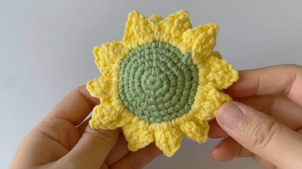 The steps guide you to make the round sunflower center first, then crochet bright petals in a circle around it, giving the finished piece a clear and lively shape that stands out more than flat designs.