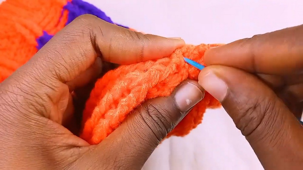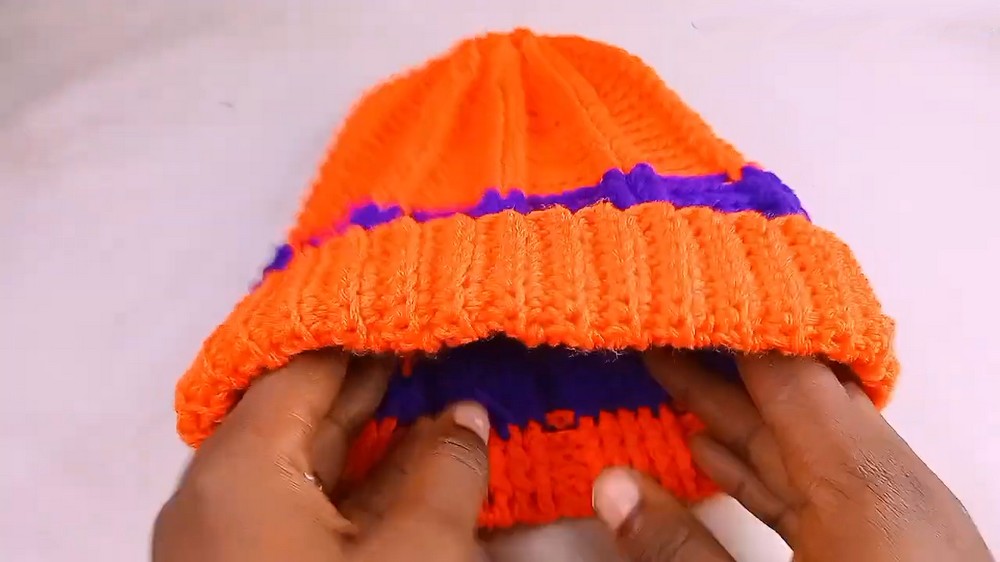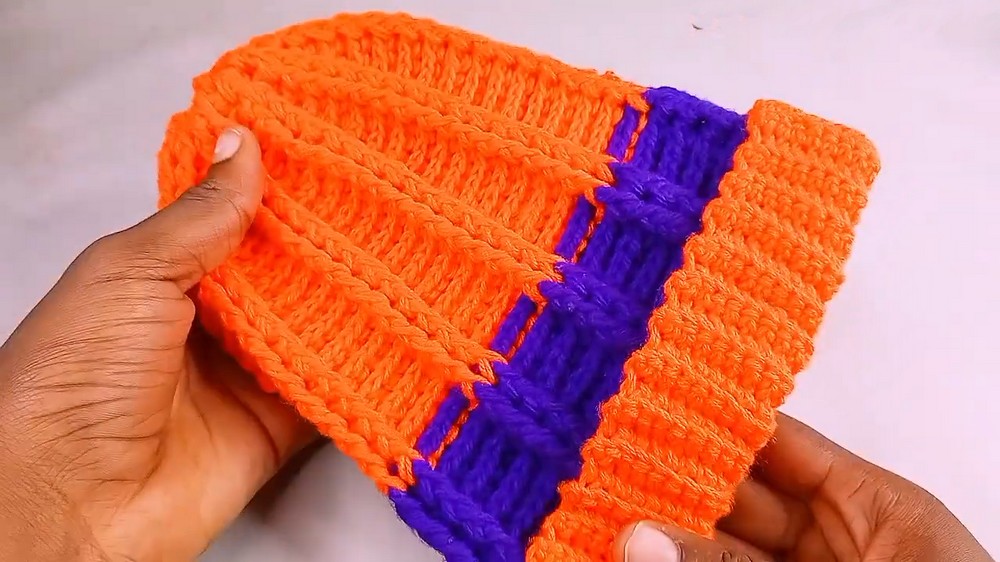 Once the brim reaches the desired length, it’s connected using slip stitches for a secure fit. The body of the hat is then constructed with rounds of double crochet stitches.