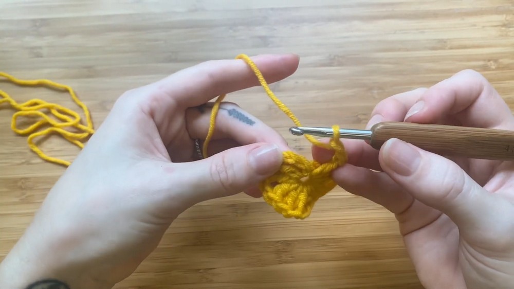 - Pull the yarn to the front, chain 2 (counts as your first double crochet), and add 2 double crochets in the same corner.