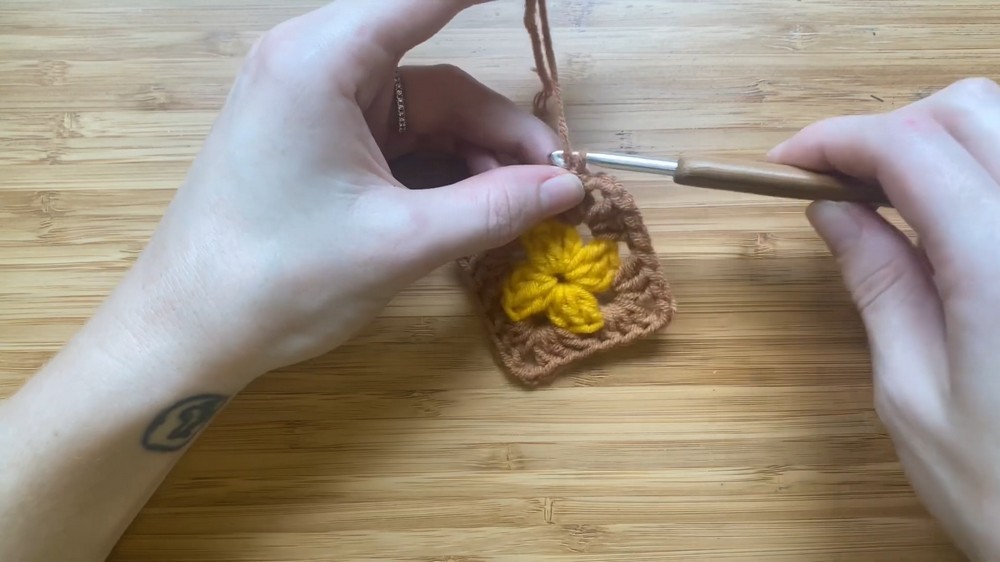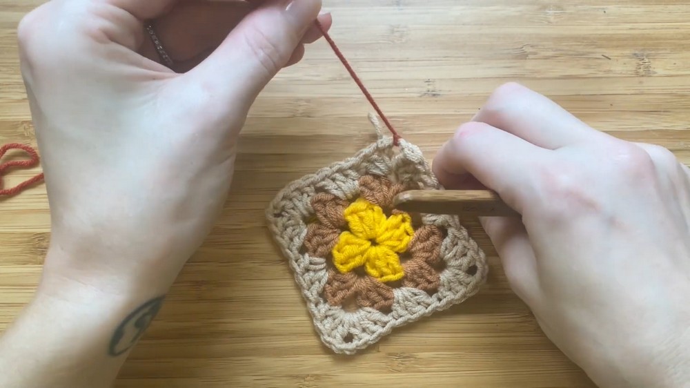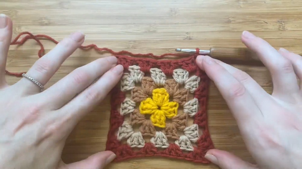 - Follow the same process for color 3 and color 4, repeating the steps of chaining, crocheting into corners, and expanding the granny square.