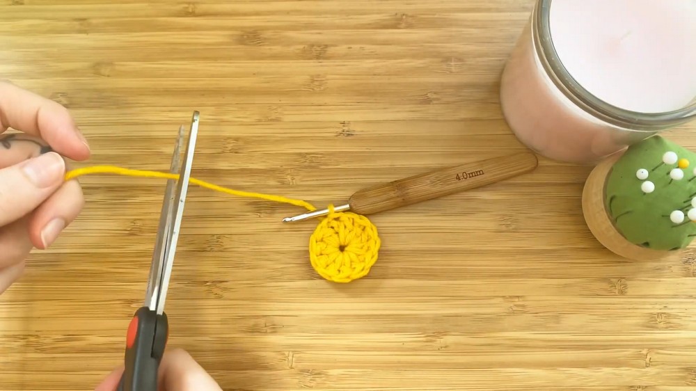 - Insert your hook from the back, pull through the yarn, and tie a knot.