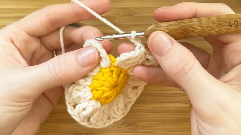 - Grab your third color for the square border. Insert the yarn, chain 4 (acts as the first treble crochet).