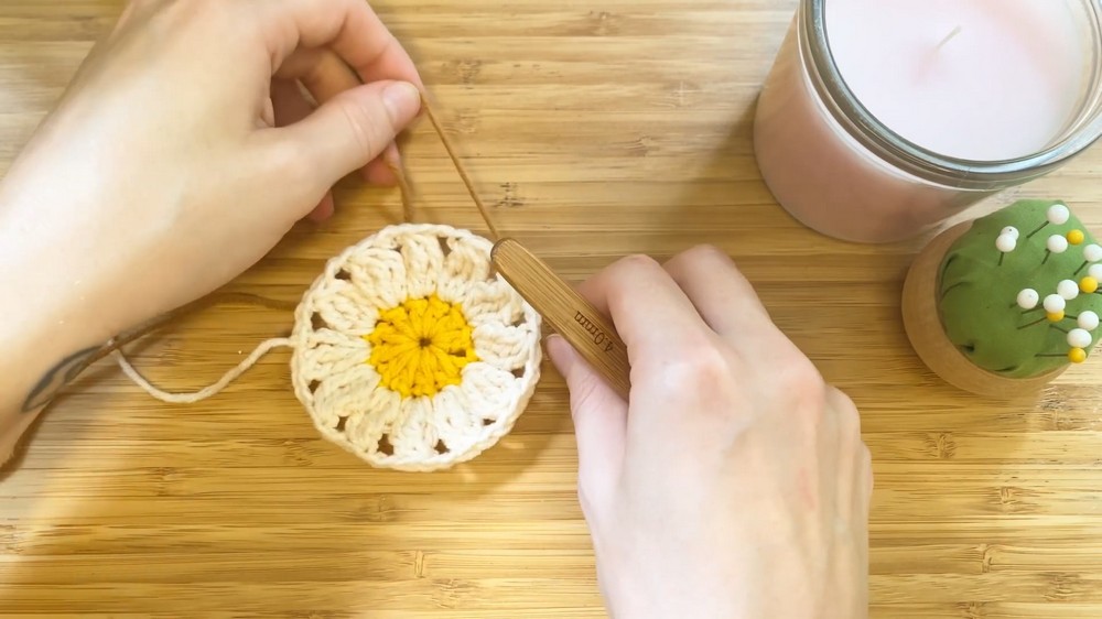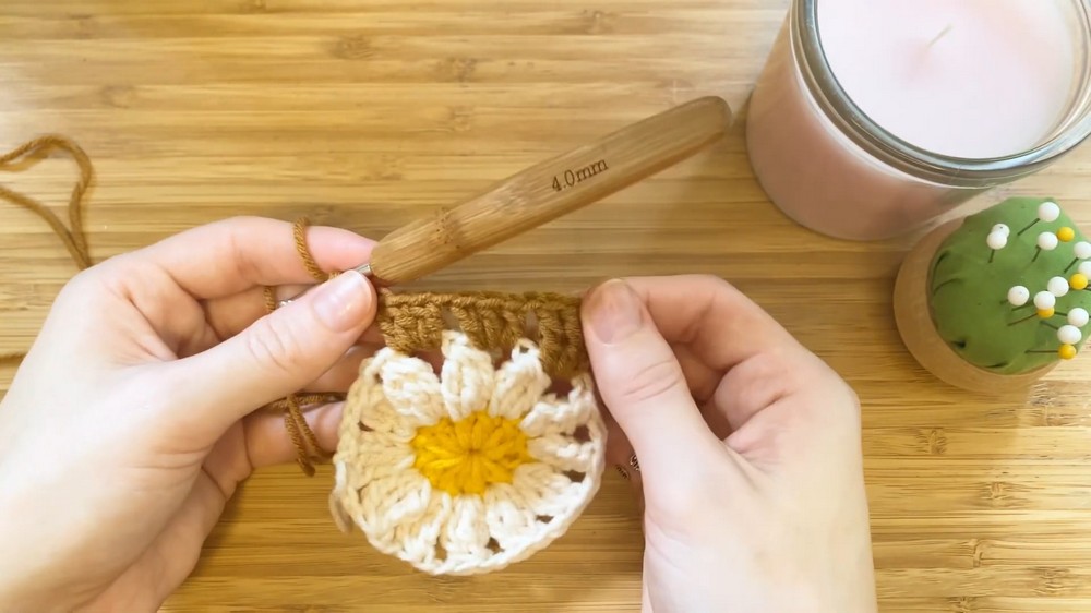 - Slip stitch into the fourth stitch of the chain to finish. Fasten off, and your Daisy Granny Square is complete!