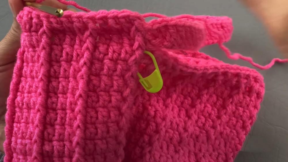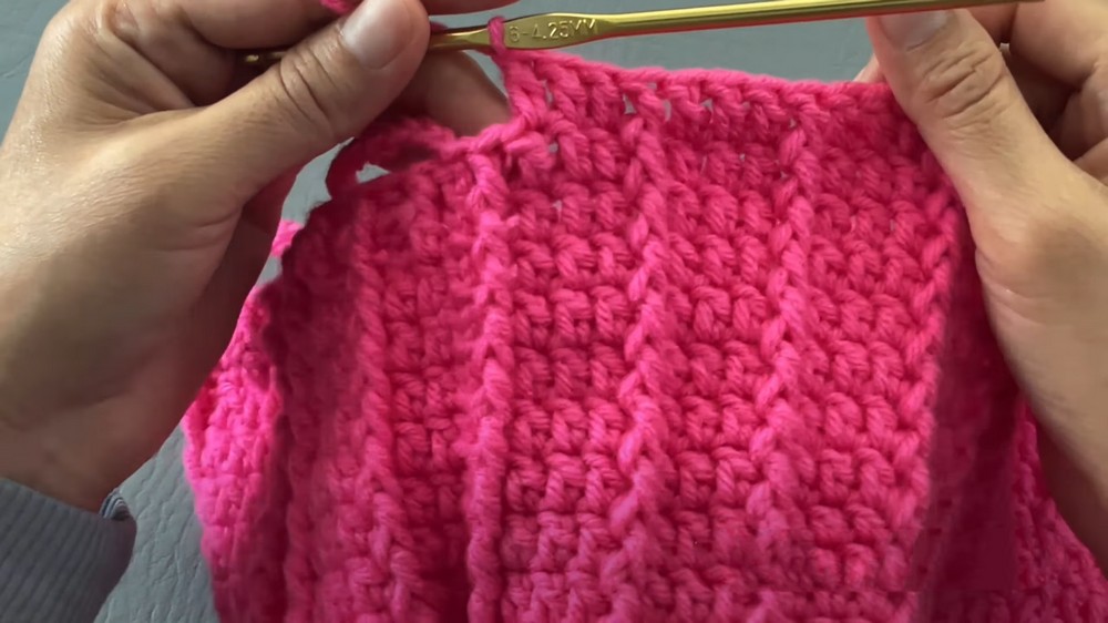 For the front and back portions, the project divides into two sections of 40 stitches each. The front features alternating FPDC and back post double crochet (BPDC) for a ribbed look, while the back follows the established FPDC with three double crochets in between pattern.