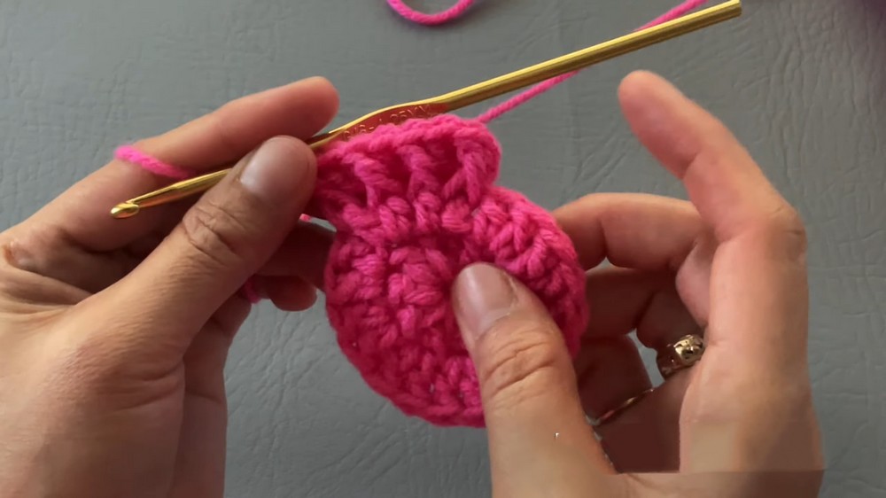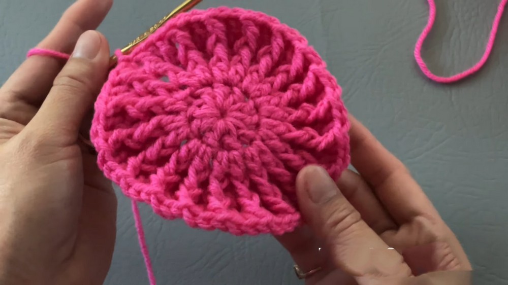 Rounds two through five involve increasing stitches while alternating double crochet and front post double crochet (FPDC), which provides the textured ribbed effect.