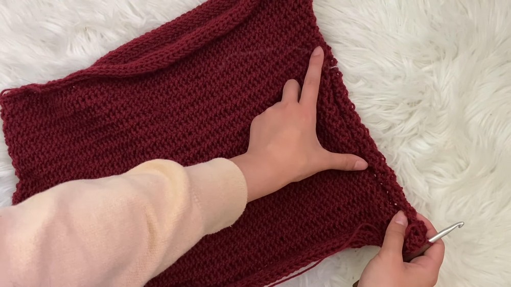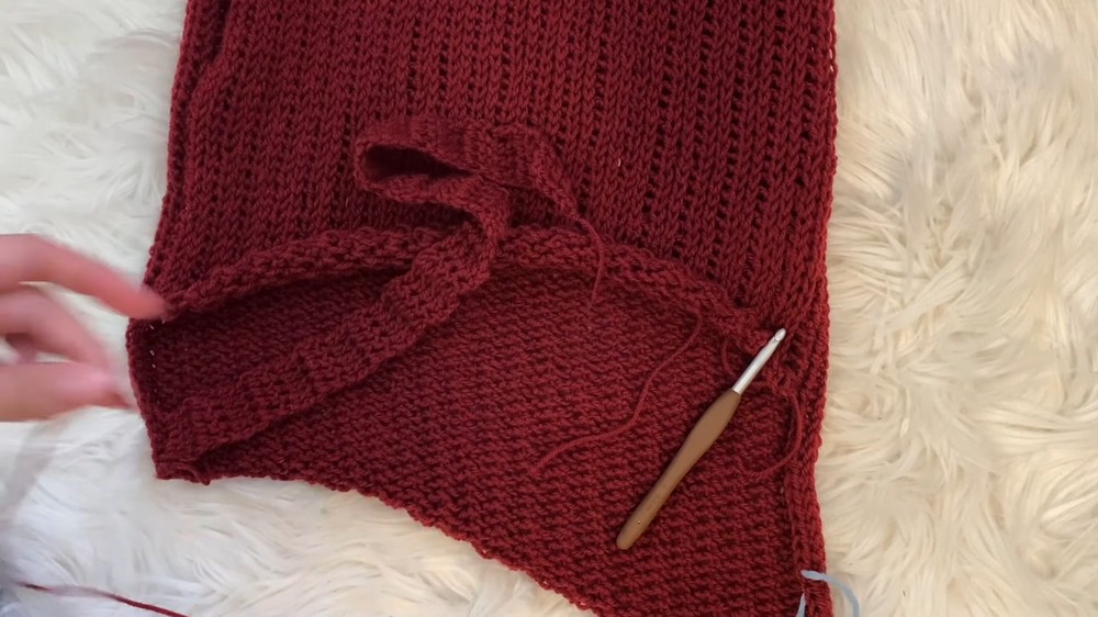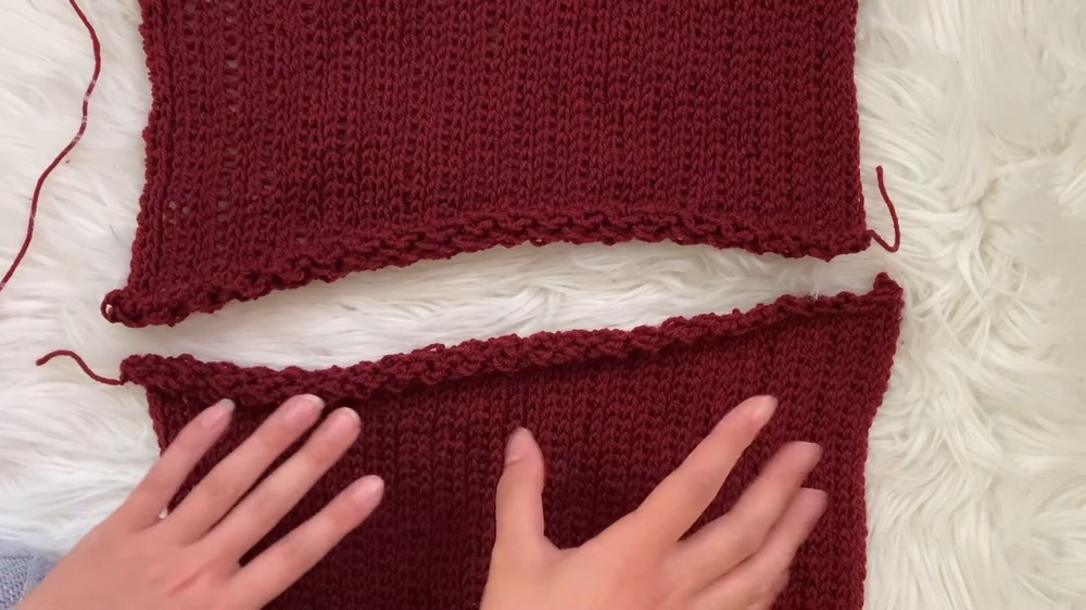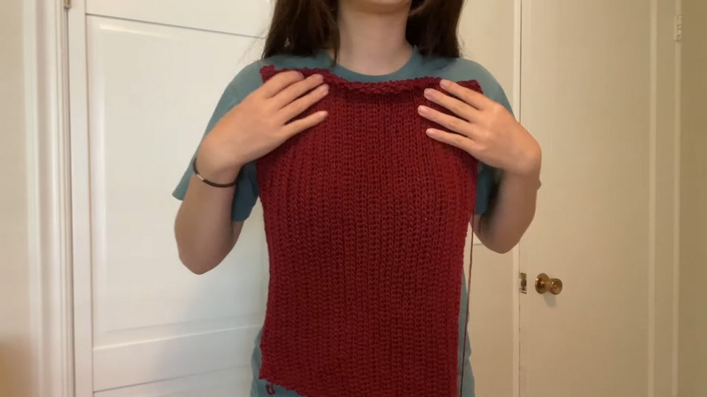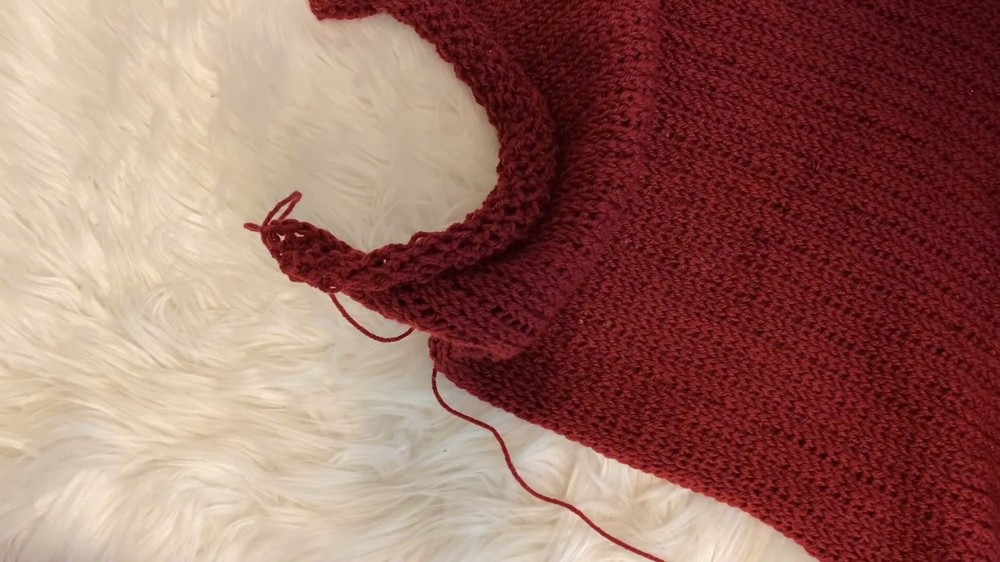 Once both panels match the shoulder measurements, they are slip-stitched together at the shoulders and sides, leaving room for armholes.