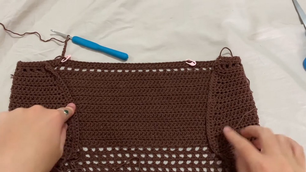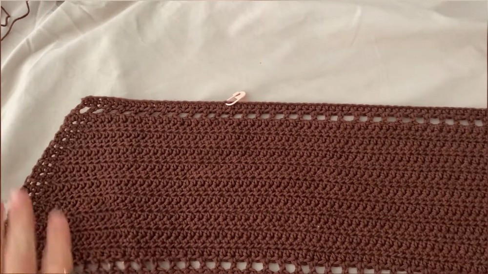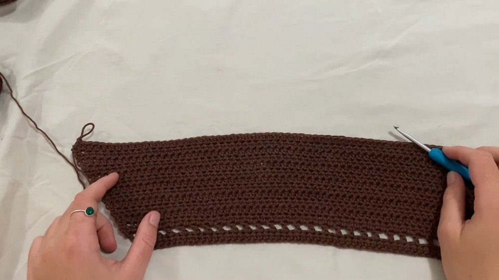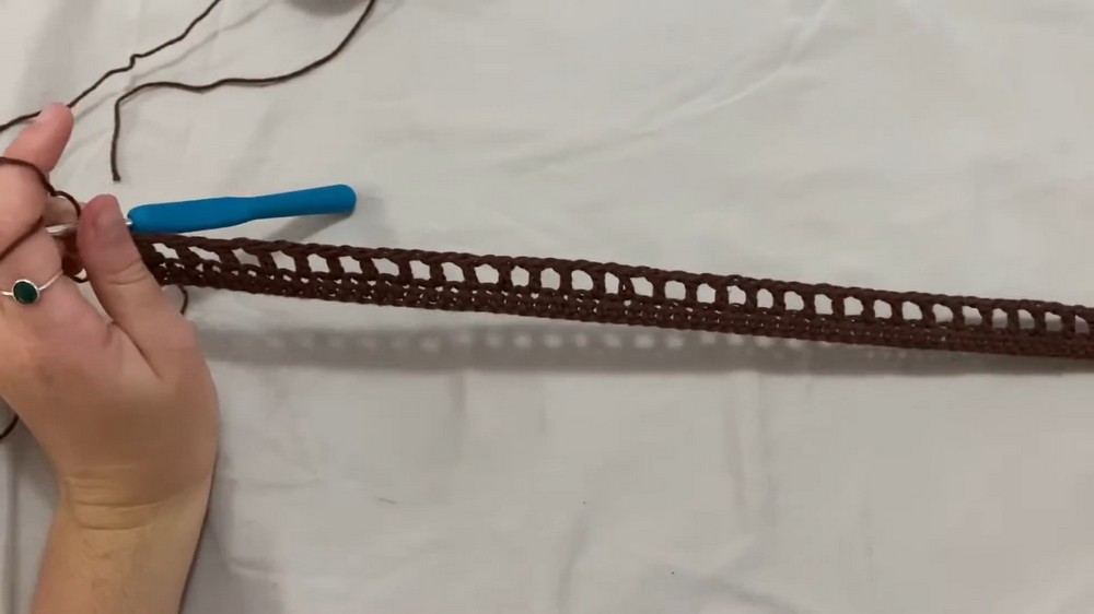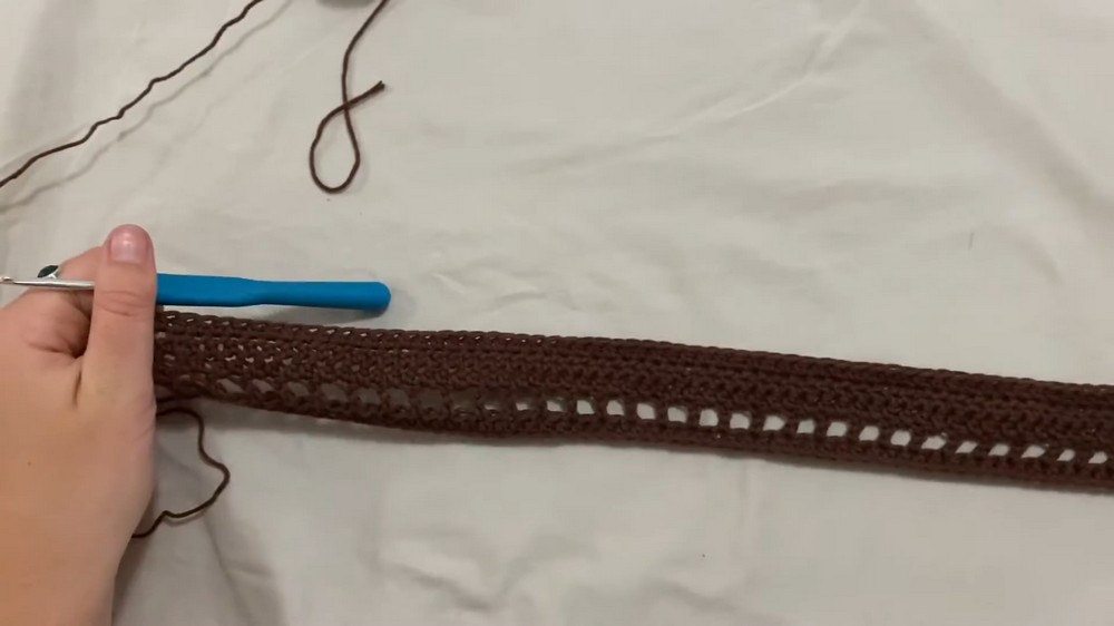 - Create gaps by chaining two and skipping two stitches, followed by a single crochet. These gaps form holes where straps can thread through.