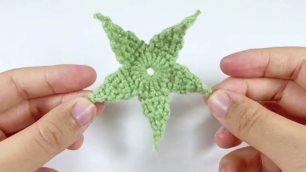 - Use green yarn. Wrap it around two fingers to create a double circle (or use a magic ring).