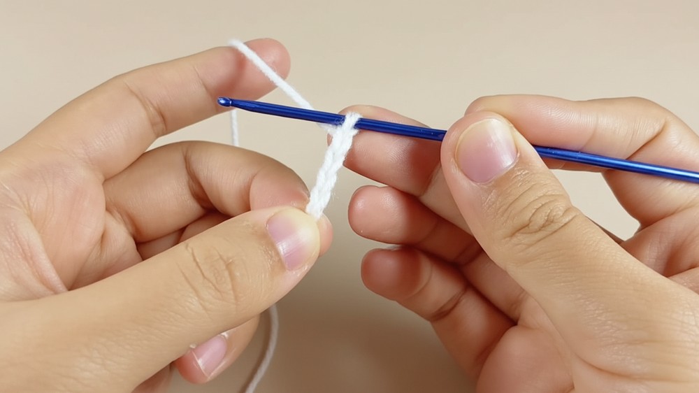 - Find the 2nd space from the hook and work single crochet (SC) in each space across until the end of the chain.