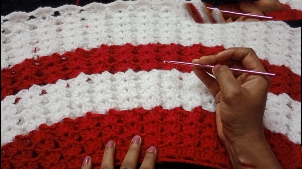 - Continue Around: Repeat 4 triple crochets with a 2-chain space in the middle double crochet stitch of the previous row.