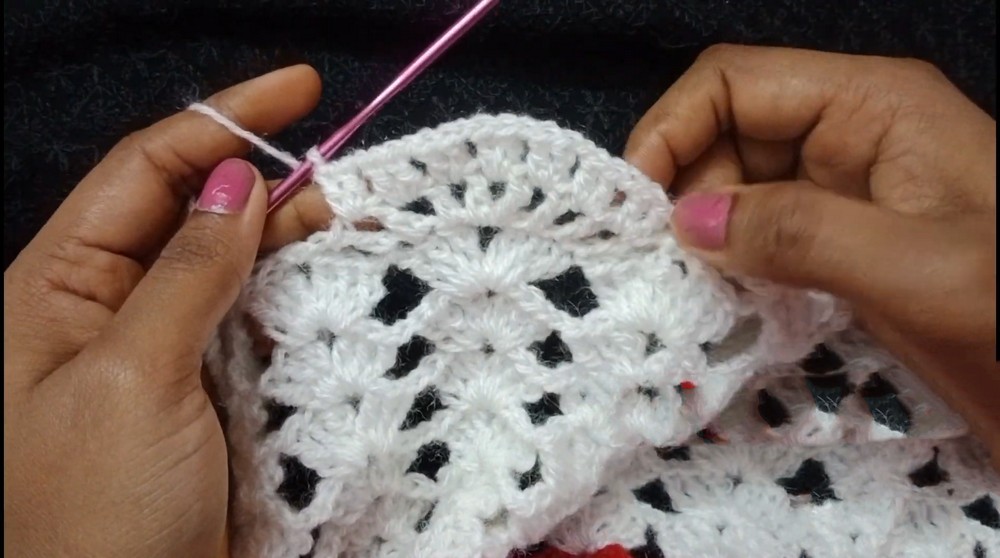 - For Row 4 and Onwards: Add 3 triple crochets, 2 chains, 3 triple crochets into each chain space, with 1 chain space separating the clusters.