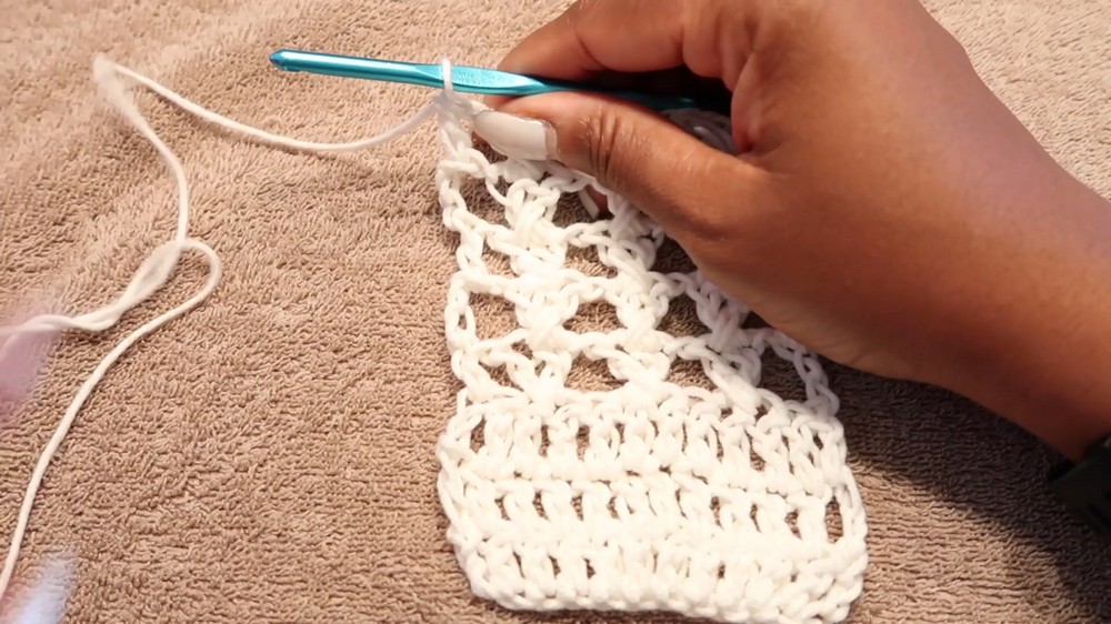 - Continue this X stitch pattern until you reach the end of the row. End with a double crochet in the top of the chain 3 from the previous row.