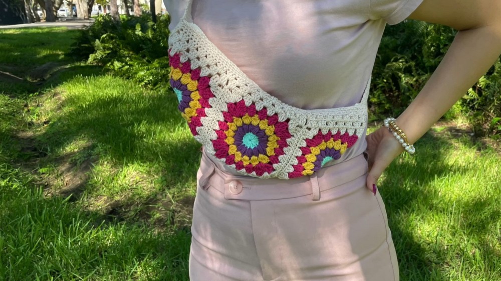Finally, assemble the front and back panels, add ribbed borders to the armholes and neck, and finish by sewing on individually crocheted daisies for that iconic floral look.